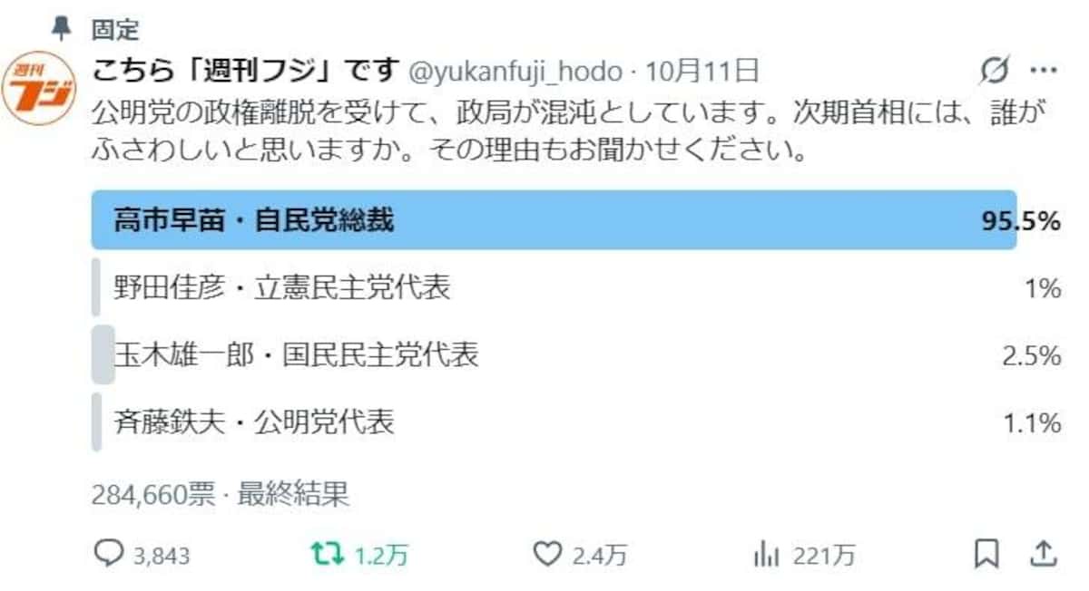 混沌(こんとん)とする政局のなか、「次期首相には、誰がふさわしいと思いますか」とアンケートをしたところ、過去最高28万4660票もの投票があった。結果は、自民党の高市早苗総裁が95・5%でトップだった。