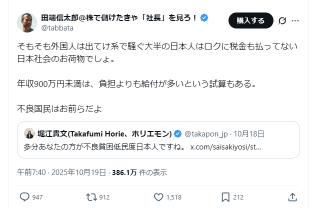 こいつの言う事を前提にすると『年収900万未満の外国人は足手まといだから全員追放するべき』ってことになるけど、大丈夫そ?