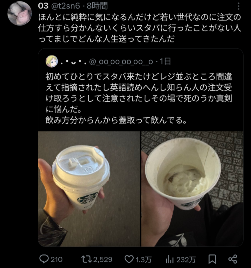 スタバは彼女に連れてかれてたから何回も行ったが、そもそもドトールもコメダもタリーズもエクセルシオールもベローチェも行ったことない身からすると若いからとかどうとか言われても用がないんだから行かないの一言に尽きるわ