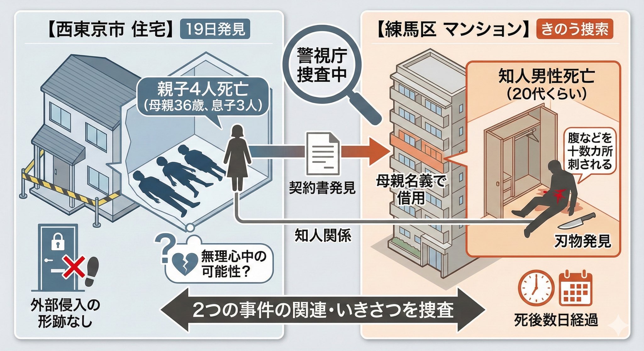 今月19日、東京・西東京市の住宅で親子4人が倒れているのが見つかり、その後死亡した事件で、母親が借りていたマンションの一室で母親の知人の男性が死亡しているのが見つかりました。この事件は今月19日、西東京… (1ページ)