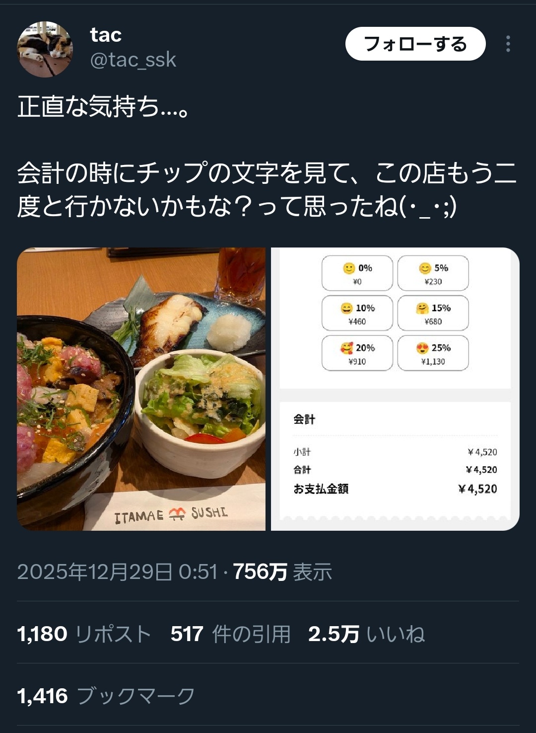 異常なほどチップ嫌う人たちは何が理由なんやろな