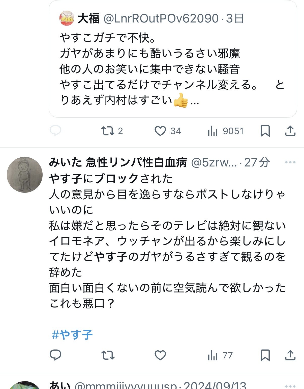 なるほど如何に工夫してブロックされずに批判的なニュアンスをやす子に伝えるかの大会かw