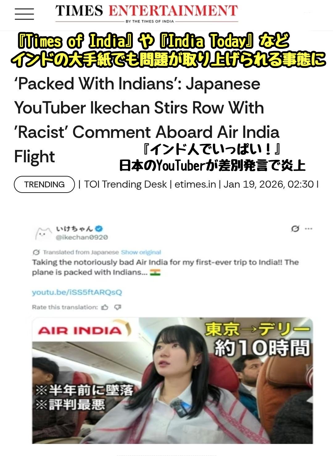 数百名がタヒ亡した飛行機事故をイジりつつ「インドは世界一汚ない国」と発言