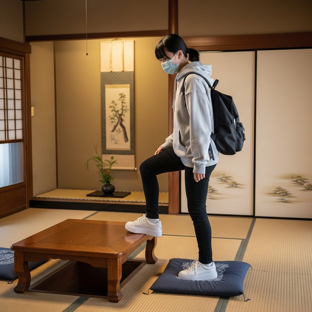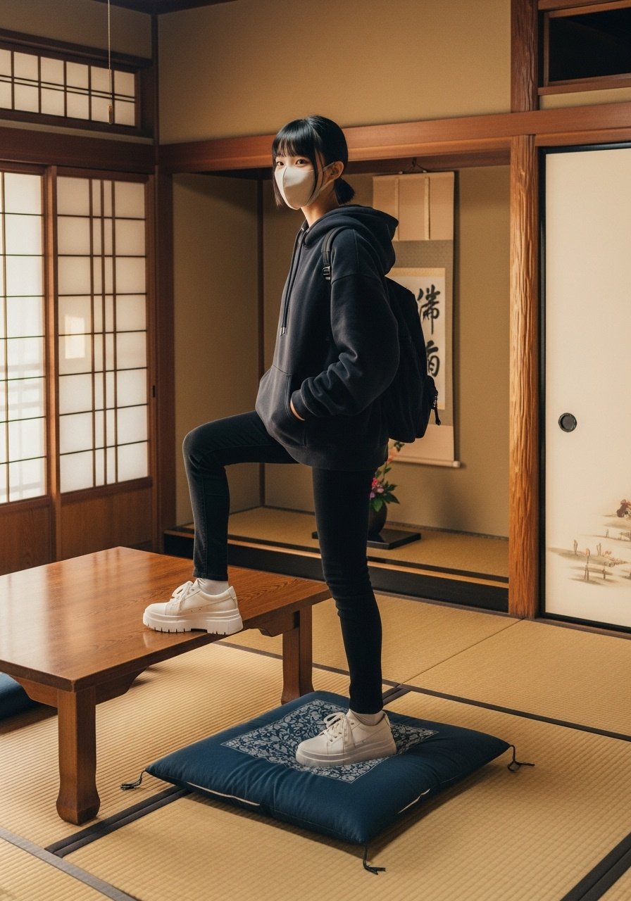 土足で畳の部屋に上がりその上座卓に足をかけるって信じられないんだが。普通に外で撮ってはダメなのか?