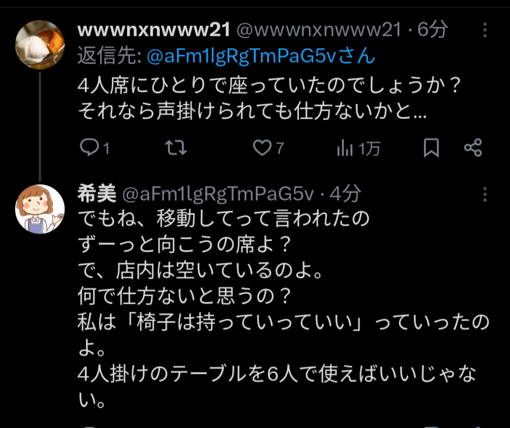 女の言い分「店内はガラガラだから私がどこに座ろうが自由。お前らは4人席で椅子だけ移動させて食えよ!」