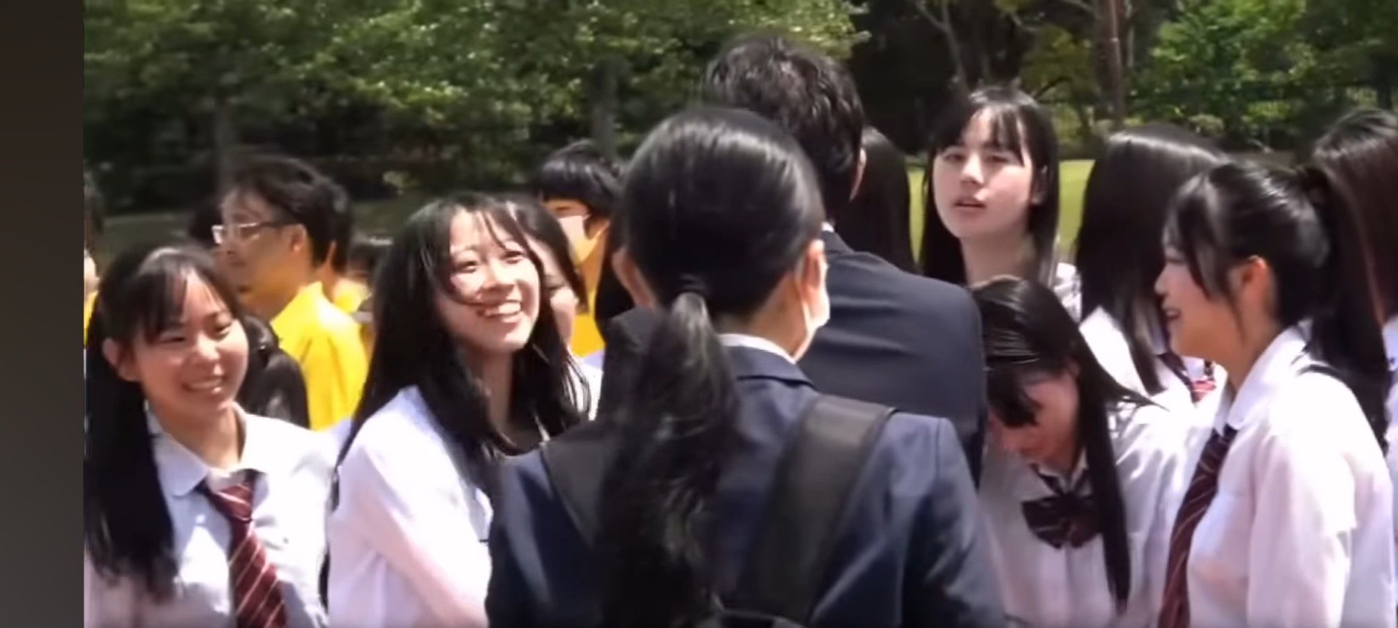 微笑んでいる女子高生に囲まれて、